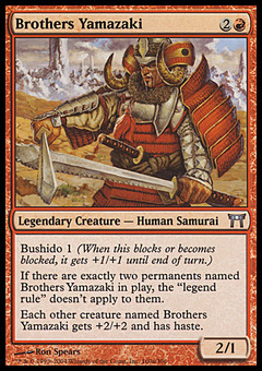Bushido 1 (When this blocks or becomes blocked, it gets +1/+1 until end of turn.) If there are exactly two permanents named Brothers Yamazaki on the battlefield, the "legend rule" doesn't apply to them. Each other creature named Brothers Yamazaki gets +2/+2 and has haste.