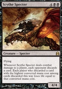 Flying Whenever Scythe Specter deals combat damage to a player, each opponent discards a card. Each player who discarded a card with the highest converted mana cost among cards discarded this way loses life equal to that converted mana cost.
