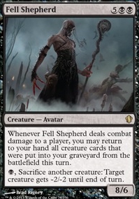 Whenever Fell Shepherd deals combat damage to a player, you may return to your hand all creature cards that were put into your graveyard from the battlefield this turn. {B}, Sacrifice another creature: Target creature gets -2/-2 until end of turn.