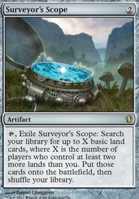 {T}, Exile Surveyor's Scope: Search your library for up to X basic land cards, where X is the number of players who control at least two more lands than you. Put those cards onto the battlefield, then shuffle your library.