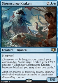 Hexproof Lieutenant - As long as you control your commander, Stormsurge Kraken gets +2/+2 and has "Whenever Stormsurge Kraken becomes blocked, you may draw two cards."