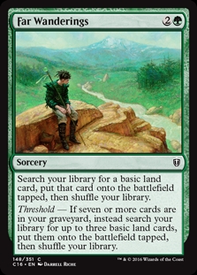 Search your library for a basic land card, put that card onto the battlefield tapped, then shuffle your library. #Threshold# - If seven or more cards are in your graveyard, instead search your library for up to three basic land cards, put them onto the battlefield tapped, then shuffle your library.