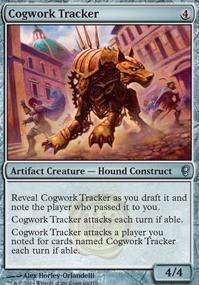 Reveal Cogwork Tracker as you draft it and note the player who passed it to you. Cogwork Tracker attacks each turn if able. Cogwork Tracker attacks a player you noted for cards named Cogwork Tracker each turn if able.