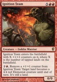Ignition Team enters the battlefield with X +1/+1 counters on it, where X is the number of tapped lands on the battlefield. {2}{R}, Remove a +1/+1 counter from Ignition Team: Target land becomes a 4/4 red Elemental creature until end of turn. It's still a land.