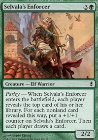 Parley - When Selvala's Enforcer enters the battlefield, each player reveals the top card of his or her library. For each nonland card revealed this way, put a +1/+1 counter on Selvala's Enforcer. Then each player draws a card.