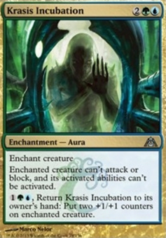 Enchant creature Enchanted creature can't attack or block, and its activated abilities can't be activated. {1}{G}{U}, Return Krasis Incubation to its owner's hand: Put two +1/+1 counters on enchanted creature.
