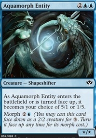 As Aquamorph Entity enters the battlefield or is turned face up, it becomes your choice of 5/1 or 1/5. Morph {2}{U} (You may cast this card face down as a 2/2 creature for {3}. Turn it face up any time for its morph cost.)