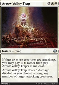 If four or more creatures are attacking, you may pay {1}{W} rather than pay Arrow Volley Trap's mana cost. Arrow Volley Trap deals 5 damage divided as you choose among any number of target attacking creatures.