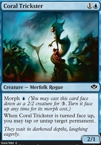 Morph {U} (You may cast this card face down as a 2/2 creature for {3}. Turn it face up any time for its morph cost.) When Coral Trickster is turned face up, you may tap or untap target permanent.