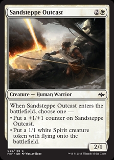When Sandsteppe Outcast enters the battlefield, choose one - � Put a +1/+1 counter on Sandsteppe Outcast. � Put a 1/1 white Spirit creature token with flying onto the battlefield.