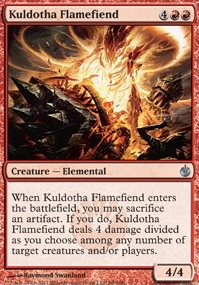 When Kuldotha Flamefiend enters the battlefield, you may sacrifice an artifact. If you do, Kuldotha Flamefiend deals 4 damage divided as you choose among any number of target creatures and/or players.