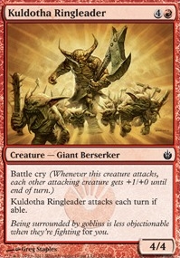 Battle cry (Whenever this creature attacks, each other attacking creature gets +1/+0 until end of turn.) Kuldotha Ringleader attacks each turn if able.