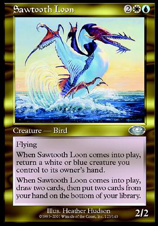 Flying When Sawtooth Loon enters the battlefield, return a white or blue creature you control to its owner's hand. When Sawtooth Loon enters the battlefield, draw two cards, then put two cards from your hand on the bottom of your library.