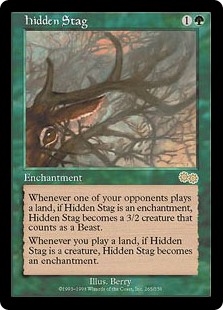 Whenever an opponent plays a land, if Hidden Stag is an enchantment, Hidden Stag becomes a 3/2 Elk Beast creature. Whenever you play a land, if Hidden Stag is a creature, Hidden Stag becomes an enchantment.