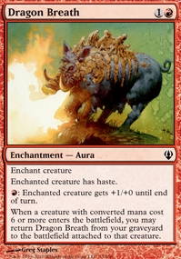 Enchant creature Enchanted creature has haste. {R}: Enchanted creature gets +1/+0 until end of turn. When a creature with converted mana cost 6 or greater enters the battlefield, you may return Dragon Breath from your graveyard to the battlefield attached to that creature.