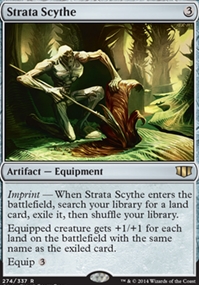#Imprint# - When Strata Scythe enters the battlefield, search your library for a land card, exile it, then shuffle your library. Equipped creature gets +1/+1 for each land on the battlefield with the same name as the exiled card. Equip {3}