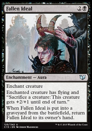 Enchant creature Enchanted creature has flying and "Sacrifice a creature: This creature gets +2/+1 until end of turn." When Fallen Ideal is put into a graveyard from the battlefield, return Fallen Ideal to its owner's hand.