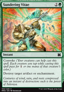 Convoke (Your creatures can help cast this spell. Each creature you tap while casting this spell pays for {1} or one mana of that creature's color.) Destroy target artifact or enchantment.