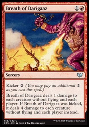 Kicker {2} (You may pay an additional {2} as you cast this spell.) Breath of Darigaaz deals 1 damage to each creature without flying and each player. If Breath of Darigaaz was kicked, it deals 4 damage to each creature without flying and each player instead.