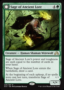 Sage of Ancient Lore's power and toughness are each equal to the number of cards in your hand. When Sage of Ancient Lore enters the battlefield, draw a card. At the beginning of each upkeep, if no spells were cast last turn, transform Sage of Ancient Lore.